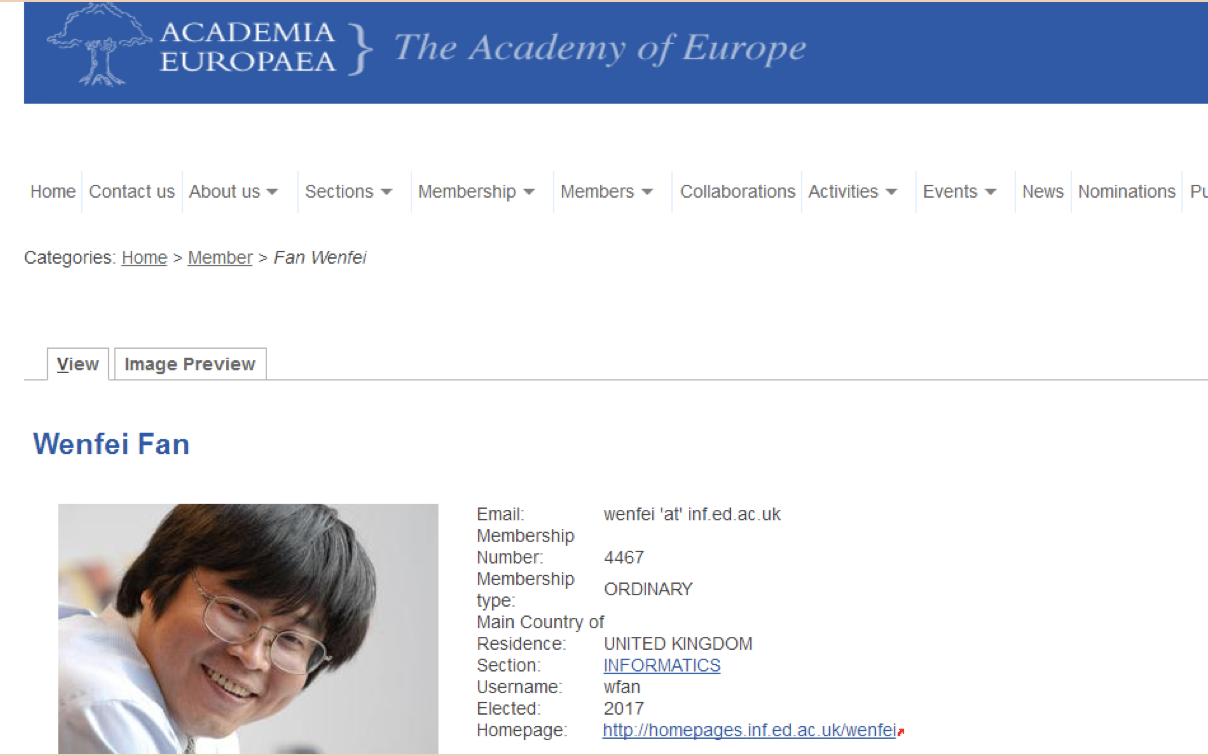 据悉, 樊文飞教授此次当选,缘由其在大数据计算和数据质量理论、算法与应用领域的杰出贡献。樊教授提出的大数据有界计算理论,已在工业界得到验证, 增进查询效率高达10万倍(5个数量级);他提出的基于不动点计算的并发模型,实现了串行图算法的自动并发化和大众化;他奠定了数据质量五个核心问题(一致性、精确性、时效性、完整性、实体识别)的理论基础,引发了国际学术界对数据质量这个重要研究领域的重新定位;他的工作以独创性、理论与应用结合被国际学术界称道。作为数据库历史上仅有的两个“大满贯”得主之一,樊院士囊括了国际数据库领域四大顶级理论和系统会议的最佳论文奖和时间检验奖 (SIGMOD 2017, PODS 2010 和2015,VLDB 2010, ICDE 2007);回国效力的十年间,他至少获得了八项国际大奖和荣誉,并对国内两个973项目做出了重要贡献。